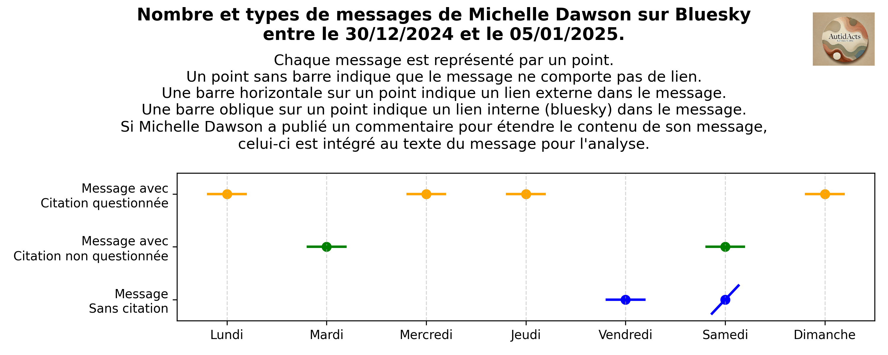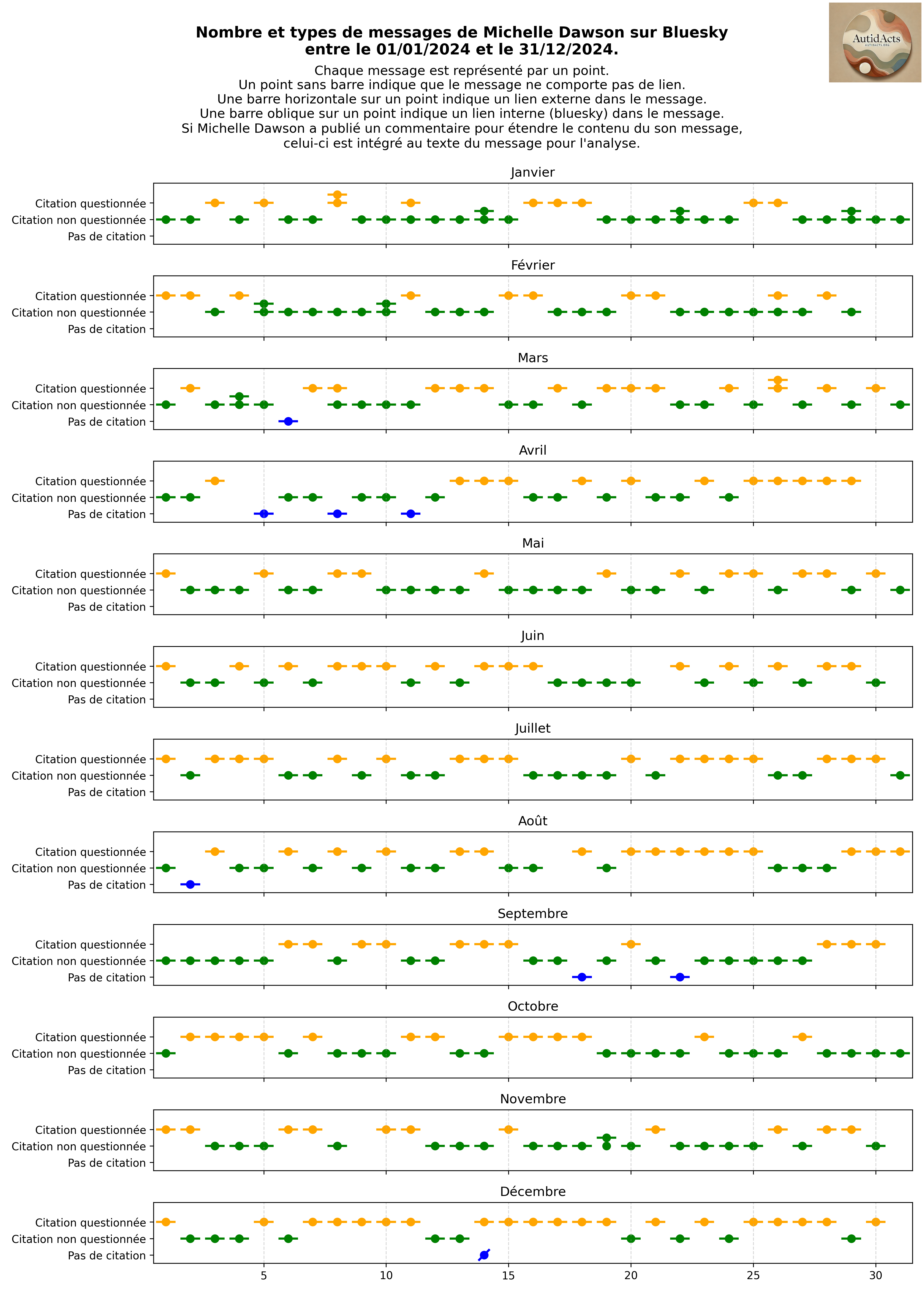 En 2024, Michelle Dawson a partagé 374 messages sur Bluesky, dont 29 étaient accompagnés d’un commentaire pour étendre quelque peu le contenu de son message. Plus de 99 % de ces messages incluaient un lien, généralement vers une publication scientifique traitant de l’autisme. Dans 18 % des cas, le lien renvoyait à un sujet associé, identifié par la mention « autism-relevant ». Une très large majorité des messages (97 %) comportait une citation, qu’il s’agisse d’une phrase ou d’un extrait, issue du document scientifique référencé dans le message. Dans un peu plus de la moitié de ces messages contenant des citations (56 %), l’objectif était d’informer et de partager une ressource scientifique qu’elle considérait comme intéressante et qui ne suscitait pas de critiques de sa part. Pour les autres, représentant un peu moins de la moitié des messages, Michelle Dawson soulevait une question, souvent sur des aspects éthiques ou méthodologiques de l’étude référencée. Cette interrogation pouvait prendre une forme succincte, marquée simplement par un point d’interrogation placé après la citation, ou être développée à travers un bref commentaire qui questionnait un point précis de l’article, en plus du point d’interrogation après la citation. Ces messages, bien que succincts en raison des contraintes de format, constituent le socle des critiques qu’elle formule à l’égard de la recherche scientifique actuelle sur l’autisme. A ce titre, ils sont particulièrement précieux pour nous.