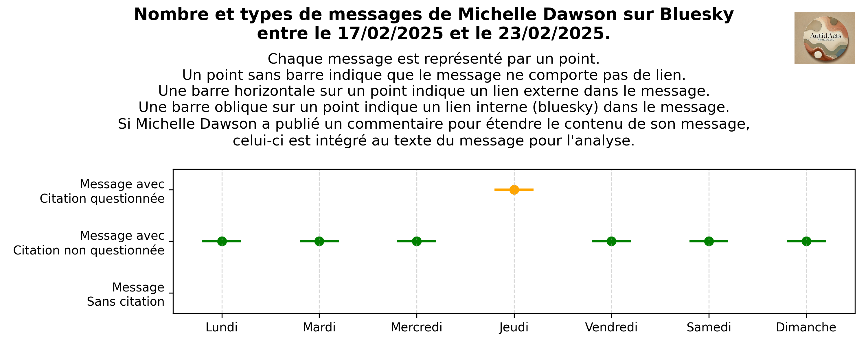 (Graphique réalisé par nos soins pour cet article. Nous avons utilisé un script Bash pour extraire les messages publics de Michelle Dawson sur Bluesky via son API ouverte, puis un script Python pour compiler les données sous forme graphique. Nous partageons volontiers ces scripts sur demande, par email – contact@autidacts.org).