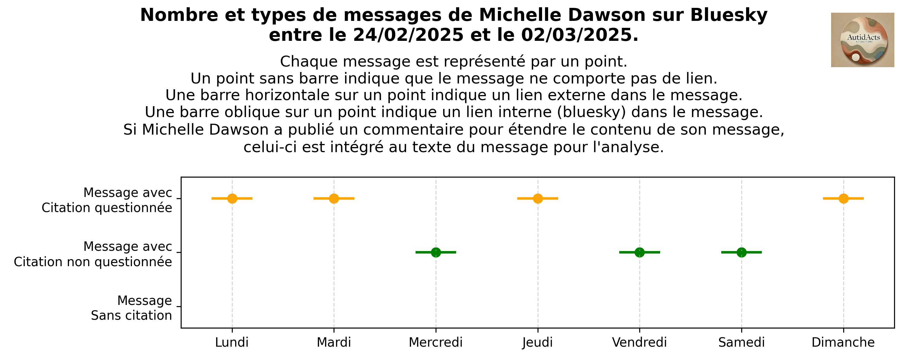 (Graphique réalisé par nos soins pour cet article. Nous avons utilisé un script Bash pour extraire les messages publics de Michelle Dawson sur Bluesky via son API ouverte, puis un script Python pour compiler les données sous forme graphique. Nous partageons volontiers ces scripts sur demande, par email – contact@autidacts.org).